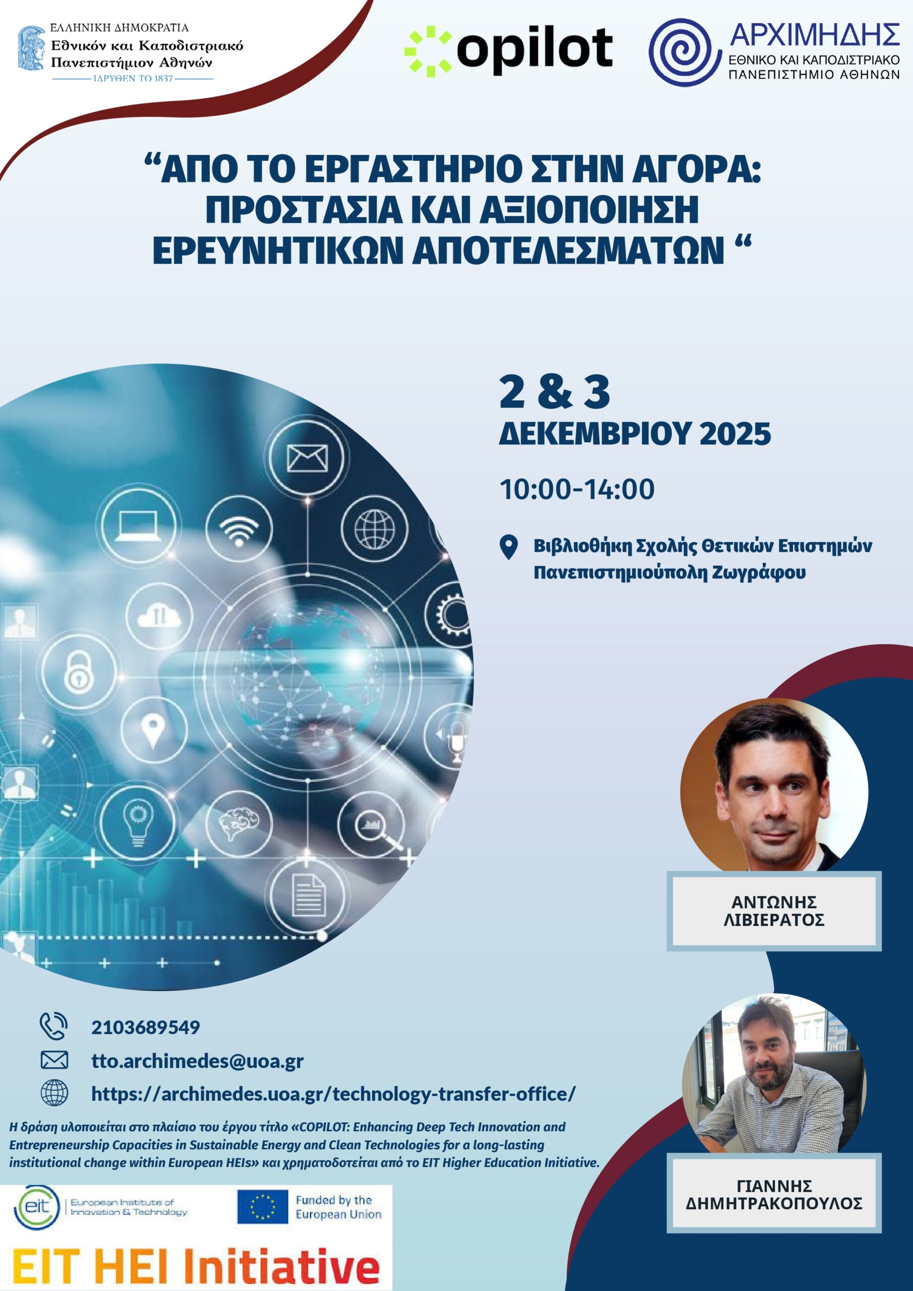 Το εκπαιδευτικό εργαστήριο «Από το Εργαστήριο στην Αγορά: Προστασία και Αξιοποίηση Ερευνητικών Αποτελεσμάτων» απευθύνεται στα μέλη της πανεπιστημιακής/ερευνητικής κοινότητας του ΕΚΠΑ, και η δράση υλοποιείται στο πλαίσιο του έργου με τίτλο «COPILOT: Enhancing Deep Tech Innovation and Entrepreneurship Capacities in Sustainable Energy and Clean Technologies for a long-lasting institutional change within European HEIs» και χρηματοδοτείται από το EIT Higher Education Initiative.