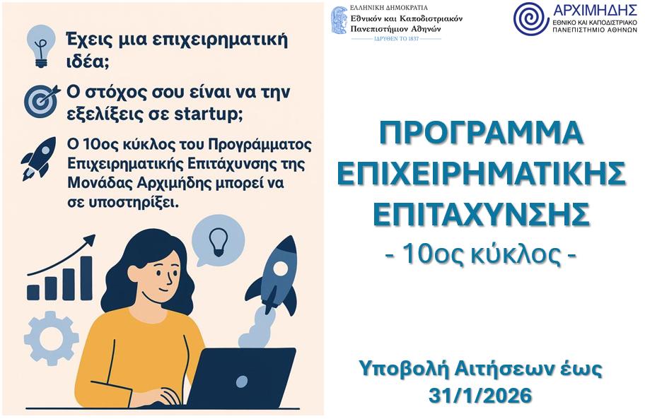 Η Μονάδα Μεταφοράς Τεχνολογίας και Καινοτομίας «Αρχιμήδης», καλεί τους φοιτητές και ερευνητές του ΕΚΠΑ που ενδιαφέρονται να αναπτύξουν ή να εξελίξουν μία επιχειρηματική ιδέα, να υποβάλλουν Αίτηση για τη συμμετοχή τους στο 10ο κύκλο του Προγράμματος Επιχειρηματικής Επιτάχυνσης.
